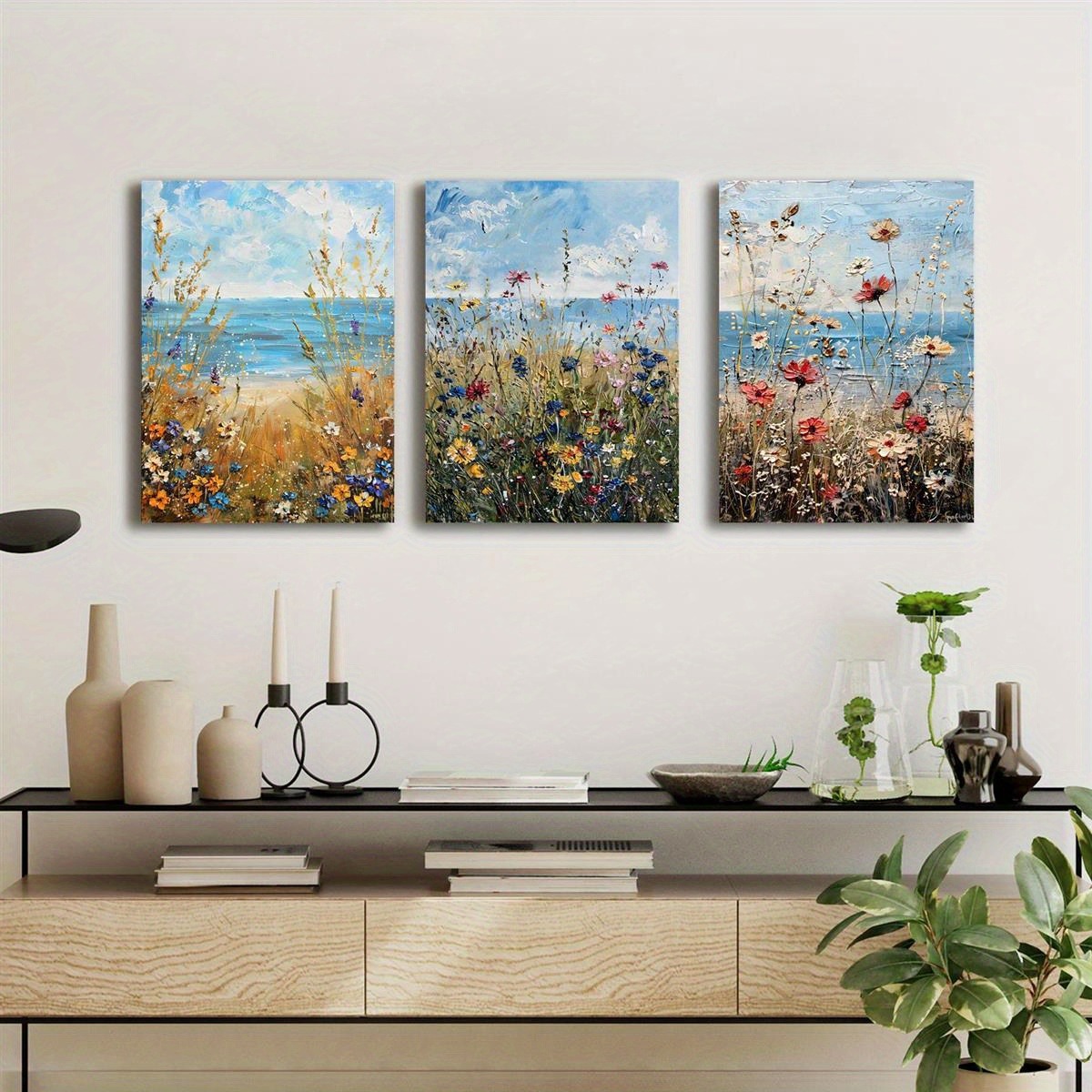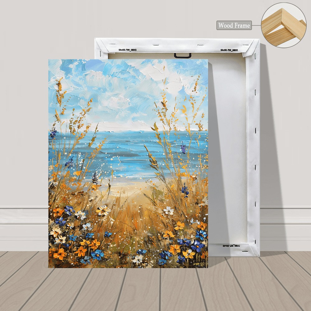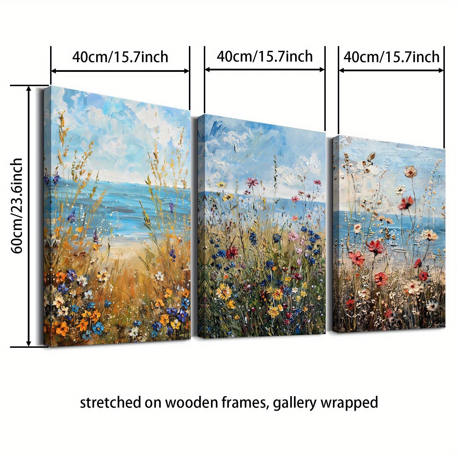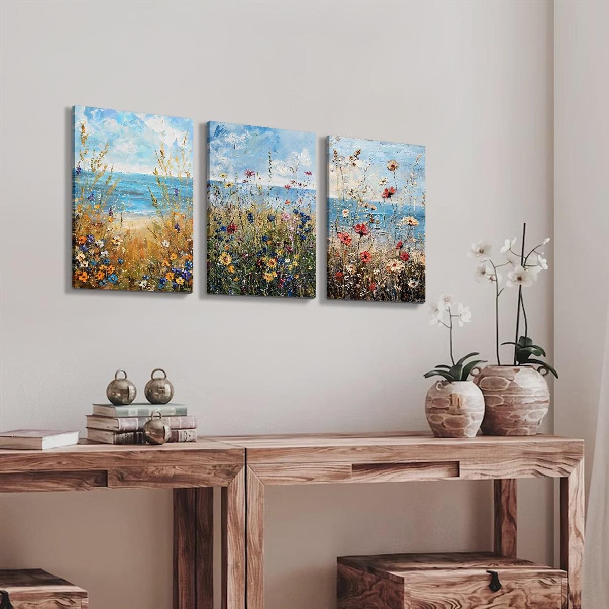 Home > Set Of 3 Canvas Wooden Framed Poster Prints Coastal Wildflowers, Ocean Beach, Vintage Seascape Oil Painting, Floral Plants, Bohemian Style, Framed Wal