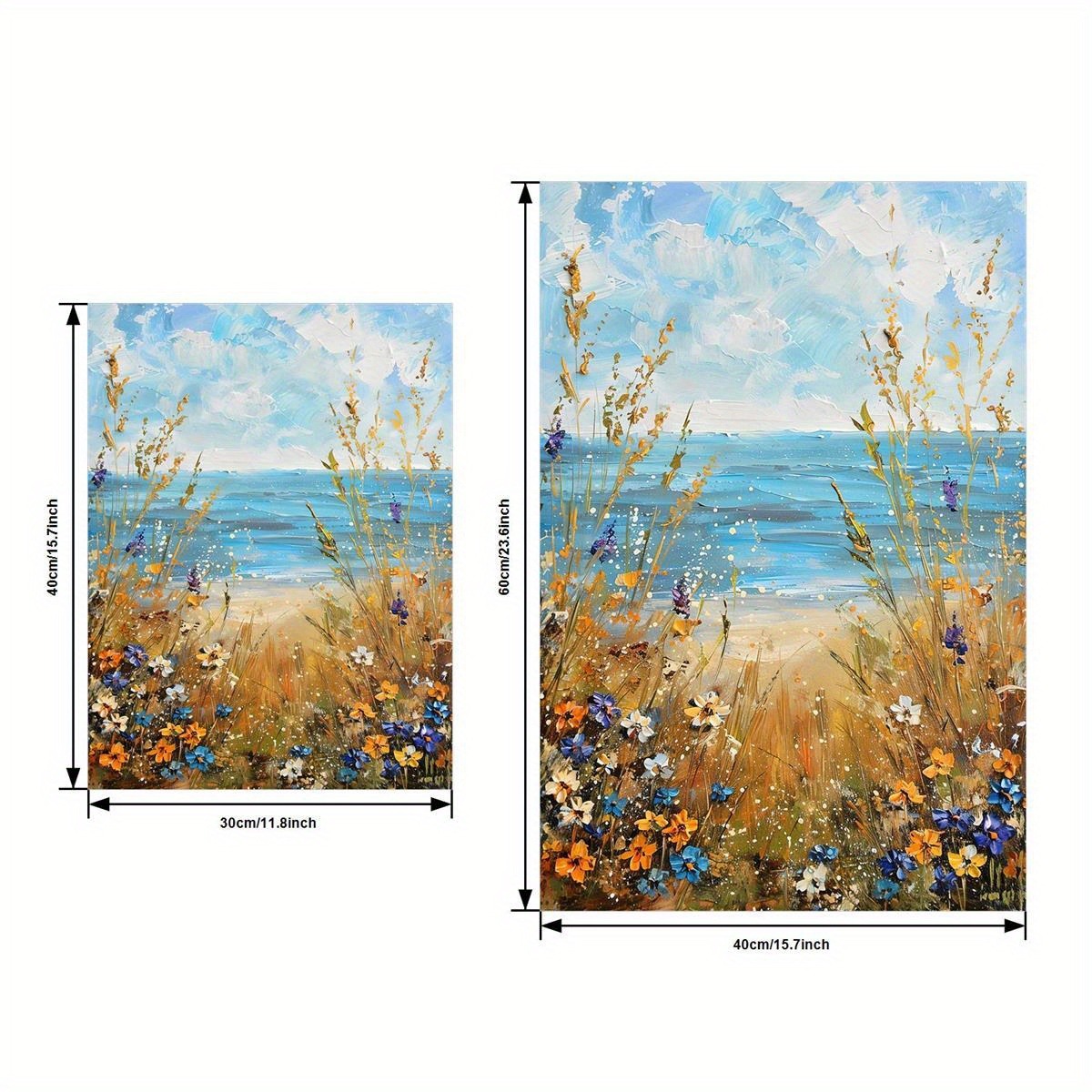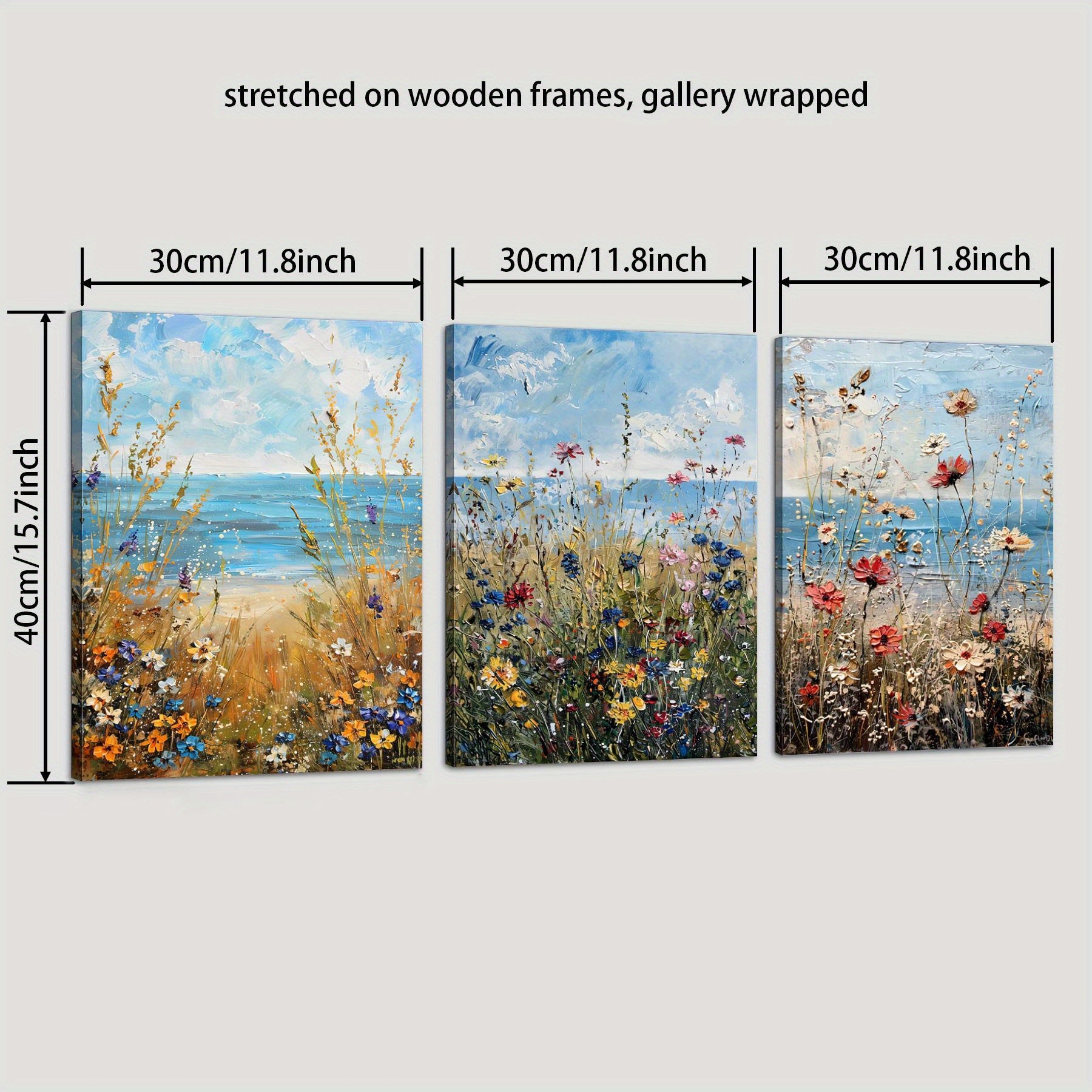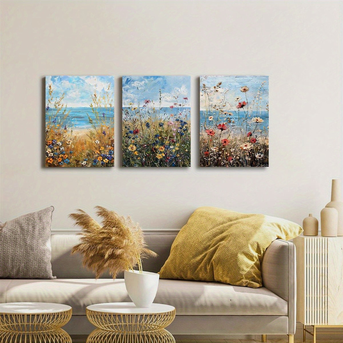 Home > Set Of 3 Canvas Wooden Framed Poster Prints Coastal Wildflowers, Ocean Beach, Vintage Seascape Oil Painting, Floral Plants, Bohemian Style, Framed Wal